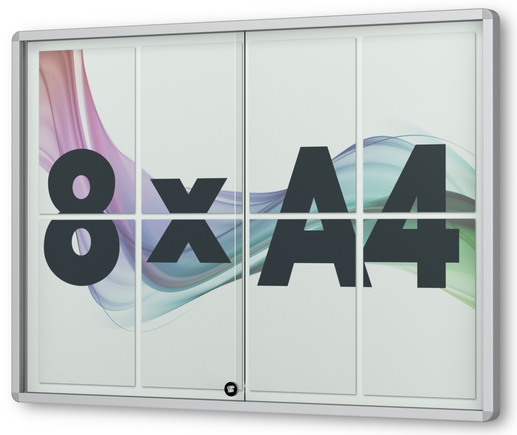 Größe: Flachschaukasten Nexus mit Schiebetüren: | 8 × DIN A4 • 925 × 665 mm B/H, 12 × DIN A4 • 925 × 975 mm B/H, 18 × DIN A4 • 1365 × 975 mm B/H |