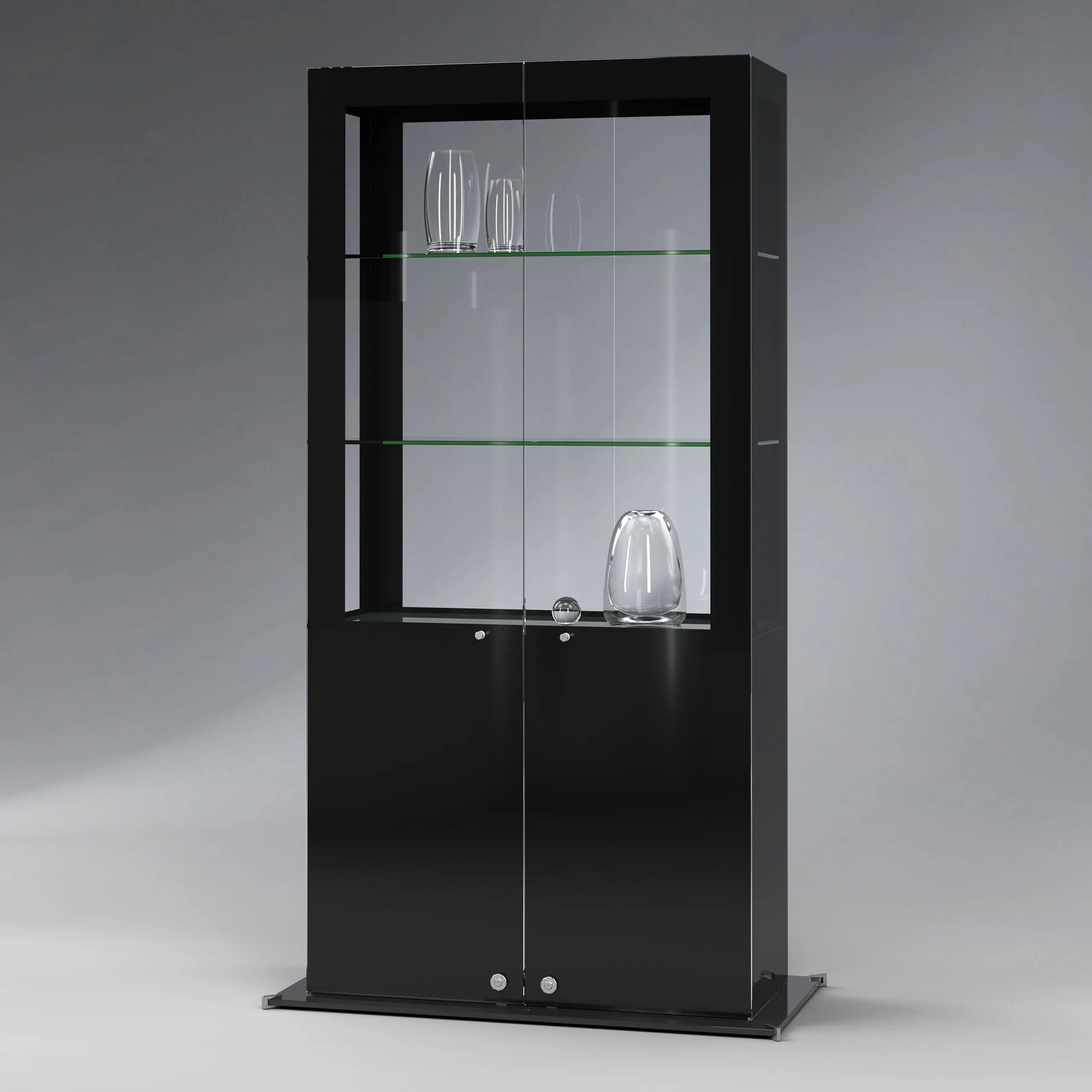| Merkmale Vitrine: | Farbe schwarz, abschliessbar, mit Drehtüren, stehend |